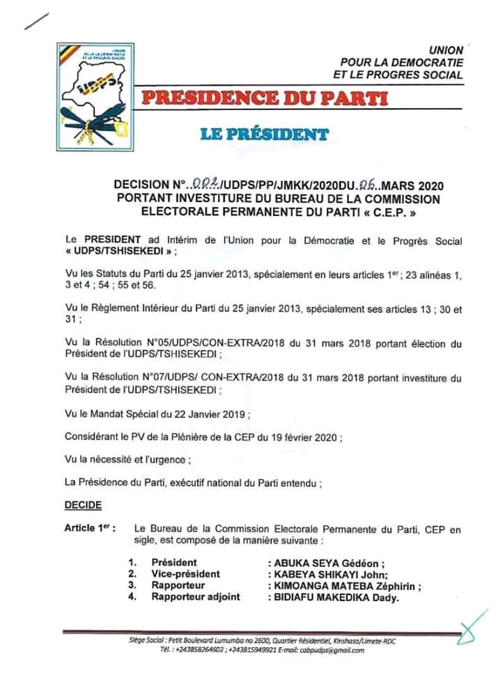 Gédéon Abuka est le nouveau président de la Commission électorale permanente (CEP) de l’Union pour la démocratie et le progrès social (UDPS). C’est ce qu’indique une décision nommant une nouvelle équipe de la CEP, signé le 06 février par le président ad intérim du parti présidentiel, Jean-Marc Kabund.