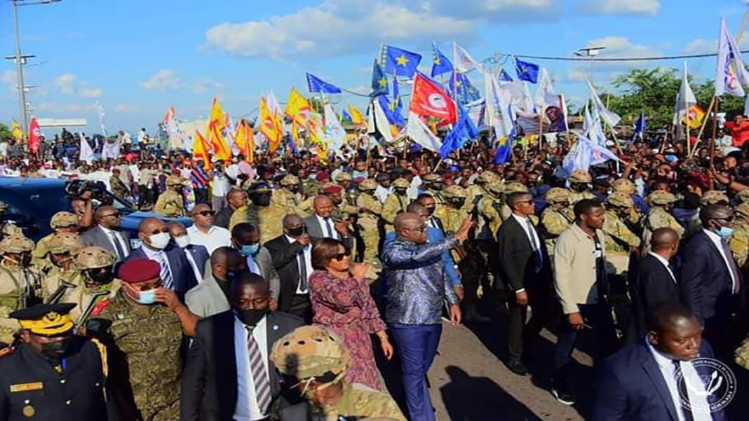 Une fois le cortège sorti des installations aéroportuaires, voyant la foule immense en liesse mobilisée pour l’accueillir, Félix Antoine Tshisekedi est descendu du véhicule pour faire quelques pas à pieds afin de saluer la foule enthousiaste.