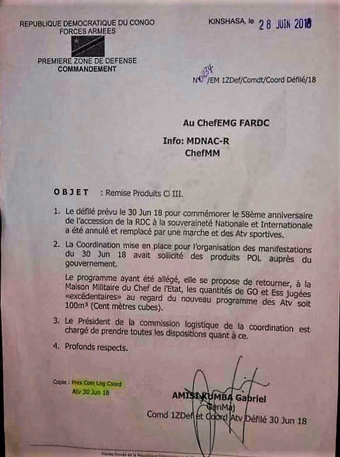 D’après un communiqué officiel (cfr. ci-dessus), signé par le Général Amisi, ce défilé annulé sera remplacé par une marche et des activités sportives.