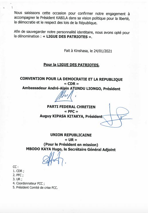 Les parti CDR, d’Alain Atundu-Liongo, PFC, d’Auguy Kipasa Kitakya et UR, membres du regroupement politique CCU et Alliés dont Lambert Mende a annoncé le ralliement à l’Union sacrée, ont « pris acte » de la décision de l’ex-porte-voix kabiliste « de quitter le FCC » (Front commun pour le Congo, coalition kabiliste).