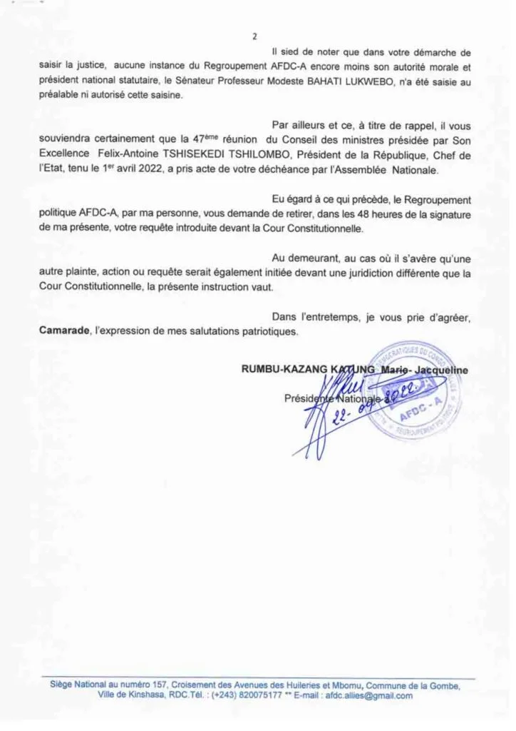 Ci-dessous la correspondance de l’AFDC-A adressé à Jean-Marie Kalumba lui demandant de retirer sa lettre.