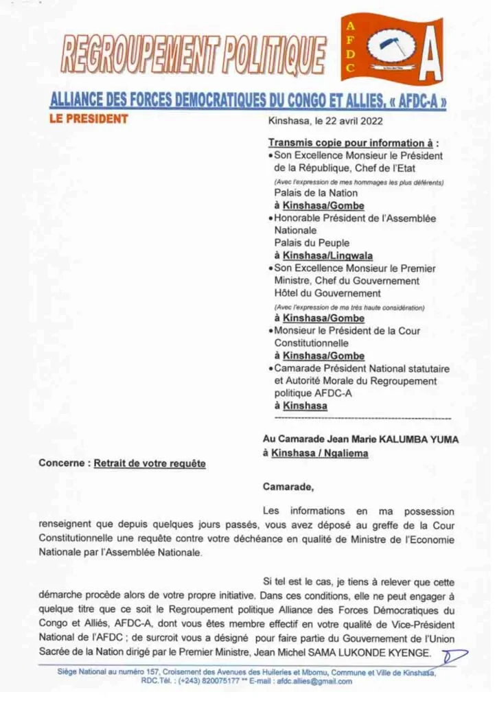 L’AFDC-A, le regroupement politique dont est membre le ministre de l’Economie nationale, Jean-Marie Kalumba déchu par l’Assemblée nationale, a sommé ce dernier, dans une correspondance datée du 22 avril, de retirer sa requête déposée au greffe de la Cour Constitutionnelle contre sa destitution.