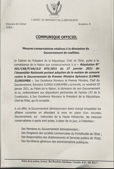 Pour rappel, le gouvernement Ilunkamba a été déchu à la suite d’une motion de censure votée à une large majorité à l’Assemblée nationale.