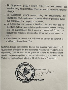 Il s’agit notamment de la suspension jusqu’à nouvel ordre, de recrutement, de nomination et de promotion du personnel à tous les niveaux, de la suspension de tout engagement, liquidation et de paiement de toutes dépenses autres que les charges du personnel.